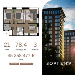 "Зорге 9" — готовые апартаменты бизнес-класса на Ходынке. 10 минут до Москва-Сити. Архитектура: 3 современных корпуса с фасадами в стиле архитектуры Нью-Йорка и с сервисами премиальных отелей, высотой до 23 этажа. Строгие линии, панорамные окна создают ощущение неподдельной роскоши и комфортной жизни в сердце мегаполиса. Проект награжден авторитетной премией European Property Awards. Резиденции: Свободная планировка, небольшая глубина этажа, огромные панорамные окна в пол до 3,6 м и высота потолков до от 3,3 до 4,3 м позволяют реализовать самые смелые концептуальные идеи и создать идеальный интерьер с учетом всех пожеланий. Вдохновляющие виды на город украсят ваш апартамент лучше любой картины. Есть возможность приобретения дизайн-проекта и полной меблировки апартаментов от партнеров девелопера. Расположение: 3 мин. пешком до парка Березовая роща 10 мин. пешком до Ходынского поля 10 мин. до ТЦ Авиапарк 30 минут до Шереметьево 10 мин до Москва-Сити или 1 станция до Москва-Сити 5 минут до ТТК 4 станции метро в шаговой доступности: 6 мин м. Полежаевская (фиолетовая ветка) 7 мин МЦК Зорге (МЦК) 7 мин м. Хорошевская (голубая ветка) 10 мин МЦК Хорошёво (МЦК) Благоустройство: Собственный парк 2 га с амфитеатром и поющими фонтанами. В парке высажено 136 деревьев и более 11 000 кустов и мелких растений из немецких питомников. Площадка для йоги и воркаут-зона со спортивными площадками. Теннисные столы и детский плейхаб Две башни Авторское гранд-лобби В лобби предусмотрена лаундж-зона, чайная с камином, комната для хранения велосипедов и колясок. Доступ по системе FACE ID. В отделке лобби и лифтовых холлов использован декоративный камень итальянского бренда Atlas Concorde Пентхаусы На верхнем уровне комплекса расположены роскошные просторные пентхаусы с высотой потолка до 4,2 метра и панорамными окнами до 3,6 метров, открывающими великолепные виды на столицу. Пентхаусы с выходами на собственные приватные террасы на кровле, площадью от 150 кв. м являются жильем high-уровня, демонстрирующим высокий статус владельца.