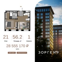 "Зорге 9" — готовые апартаменты бизнес-класса на Ходынке. 10 минут до Москва-Сити. Архитектура: 3 современных корпуса с фасадами в стиле архитектуры Нью-Йорка и с сервисами премиальных отелей, высотой до 23 этажа. Строгие линии, панорамные окна создают ощущение неподдельной роскоши и комфортной жизни в сердце мегаполиса. Проект награжден авторитетной премией European Property Awards. Резиденции: Свободная планировка, небольшая глубина этажа, огромные панорамные окна в пол до 3,6 м и высота потолков до от 3,3 до 4,3 м позволяют реализовать самые смелые концептуальные идеи и создать идеальный интерьер с учетом всех пожеланий. Вдохновляющие виды на город украсят ваш апартамент лучше любой картины. Есть возможность приобретения дизайн-проекта и полной меблировки апартаментов от партнеров девелопера. Расположение: 3 мин. пешком до парка Березовая роща 10 мин. пешком до Ходынского поля 10 мин. до ТЦ Авиапарк 30 минут до Шереметьево 10 мин до Москва-Сити или 1 станция до Москва-Сити 5 минут до ТТК 4 станции метро в шаговой доступности: 6 мин м. Полежаевская (фиолетовая ветка) 7 мин МЦК Зорге (МЦК) 7 мин м. Хорошевская (голубая ветка) 10 мин МЦК Хорошёво (МЦК) Благоустройство: Собственный парк 2 га с амфитеатром и поющими фонтанами. В парке высажено 136 деревьев и более 11 000 кустов и мелких растений из немецких питомников. Площадка для йоги и воркаут-зона со спортивными площадками. Теннисные столы и детский плейхаб Две башни Авторское гранд-лобби В лобби предусмотрена лаундж-зона, чайная с камином, комната для хранения велосипедов и колясок. Доступ по системе FACE ID. В отделке лобби и лифтовых холлов использован декоративный камень итальянского бренда Atlas Concorde Пентхаусы На верхнем уровне комплекса расположены роскошные просторные пентхаусы с высотой потолка до 4,2 метра и панорамными окнами до 3,6 метров, открывающими великолепные виды на столицу. Пентхаусы с выходами на собственные приватные террасы на кровле, площадью от 150 кв. м являются жильем high-уровня, демонстрирующим высокий статус владельца.