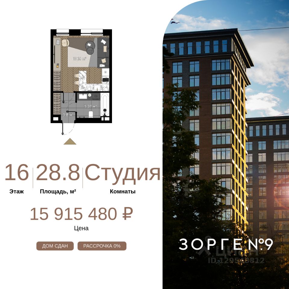 "Зорге 9" — готовые апартаменты бизнес-класса на Ходынке. 10 минут до Москва-Сити. Архитектура: 3 современных корпуса с фасадами в стиле архитектуры Нью-Йорка и с сервисами премиальных отелей, высотой до 23 этажа. Строгие линии, панорамные окна создают ощущение неподдельной роскоши и комфортной жизни в сердце мегаполиса. Проект награжден авторитетной премией European Property Awards. Резиденции: Свободная планировка, небольшая глубина этажа, огромные панорамные окна в пол до 3,6 м и высота потолков до от 3,3 до 4,3 м позволяют реализовать самые смелые концептуальные идеи и создать идеальный интерьер с учетом всех пожеланий. Вдохновляющие виды на город украсят ваш апартамент лучше любой картины. Есть возможность приобретения дизайн-проекта и полной меблировки апартаментов от партнеров девелопера. Расположение: 3 мин. пешком до парка Березовая роща 10 мин. пешком до Ходынского поля 10 мин. до ТЦ Авиапарк 30 минут до Шереметьево 10 мин до Москва-Сити или 1 станция до Москва-Сити 5 минут до ТТК 4 станции метро в шаговой доступности: 6 мин м. Полежаевская (фиолетовая ветка) 7 мин МЦК Зорге (МЦК) 7 мин м. Хорошевская (голубая ветка) 10 мин МЦК Хорошёво (МЦК) Благоустройство: Собственный парк 2 га с амфитеатром и поющими фонтанами. В парке высажено 136 деревьев и более 11 000 кустов и мелких растений из немецких питомников. Площадка для йоги и воркаут-зона со спортивными площадками. Теннисные столы и детский плейхаб Две башни Авторское гранд-лобби В лобби предусмотрена лаундж-зона, чайная с камином, комната для хранения велосипедов и колясок. Доступ по системе FACE ID. В отделке лобби и лифтовых холлов использован декоративный камень итальянского бренда Atlas Concorde Пентхаусы На верхнем уровне комплекса расположены роскошные просторные пентхаусы с высотой потолка до 4,2 метра и панорамными окнами до 3,6 метров, открывающими великолепные виды на столицу. Пентхаусы с выходами на собственные приватные террасы на кровле, площадью от 150 кв. м являются жильем high-уровня, демонстрирующим высокий статус владельца.
