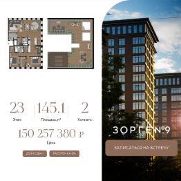 "Зорге 9" — готовые апартаменты бизнес-класса от компании St MICHAEL. 3 современных корпуса с фасадами в стиле архитектуры Нью-Йорка и с сервисами премиальных отелей, высотой до 21 этажа. На верхнем уровне комплекса расположены роскошные просторные пентхаусы с высотой потолка до 4,2 метра и панорамными окнами до 3,6 метров, открывающими великолепные виды на столицу. Пентхаусы с выходами на собственные приватные террасы на кровле, площадью от 150 кв. м являются жильем high-уровня, демонстрирующим высокий статус владельца. В них предусмотрена уникальная опция на потолках есть "световые фонари", дающие максимальный уровень света и воздуха.
