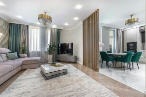 Отделка квартиры выполнена в современном светлом стиле. Грамотно спланированное пространство в сочетании с конструктивными идеями современного декора.