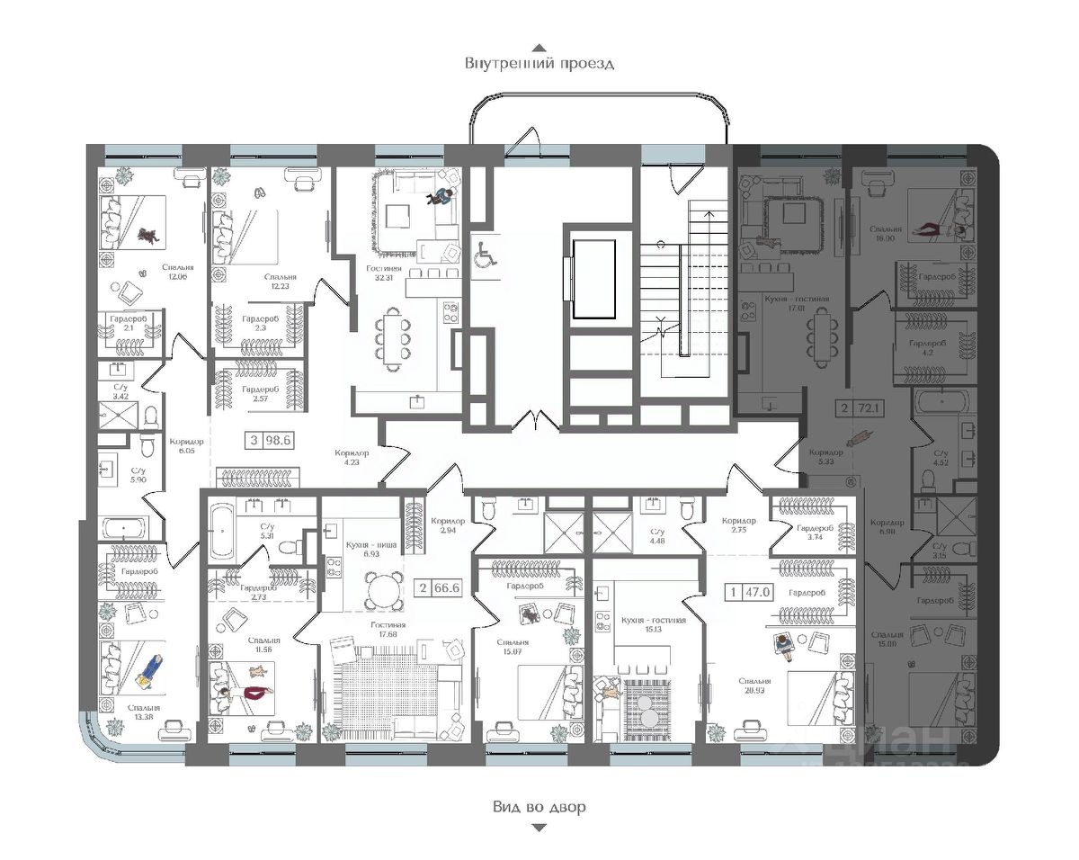 Внутренний двор 1,5 га функциональное и безопасное пространство для игр, работы и занятий спортом. Пешеходный променад для прогулок. Дома переменной этажности. Есть подземный паркинг.