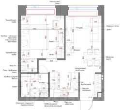 В гостиной — раскладной диван, большой обеденный стол и ТВ-зона. Кухня-ниша укомплектована всей встроенной техникой: холодильником, индукционной плитой, духовкой, микроволновкой и посудомоечной машиной.