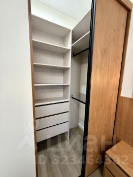 Спальня оборудована большой парящей кроватью с ортопедическим матрасом Askona (180*200), рабочим местом для удалённой работы и заказной мебелью под потолок. В прихожей — вместительный шкаф и зона хранения, в квартире достаточно места для организации быта без компромиссов.