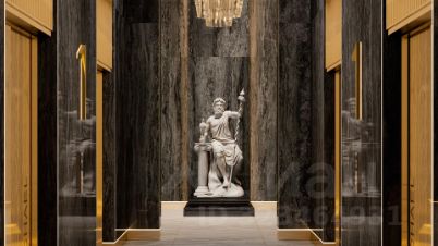 Просторное гранд-лобби с высотой потолка 7м. Дизайн Гранд Лобби выполнен в стиле классических люксовых отелей с использованием премиальных материалов.