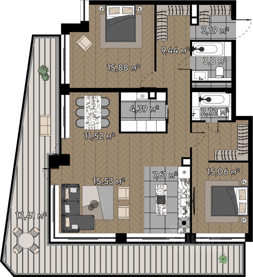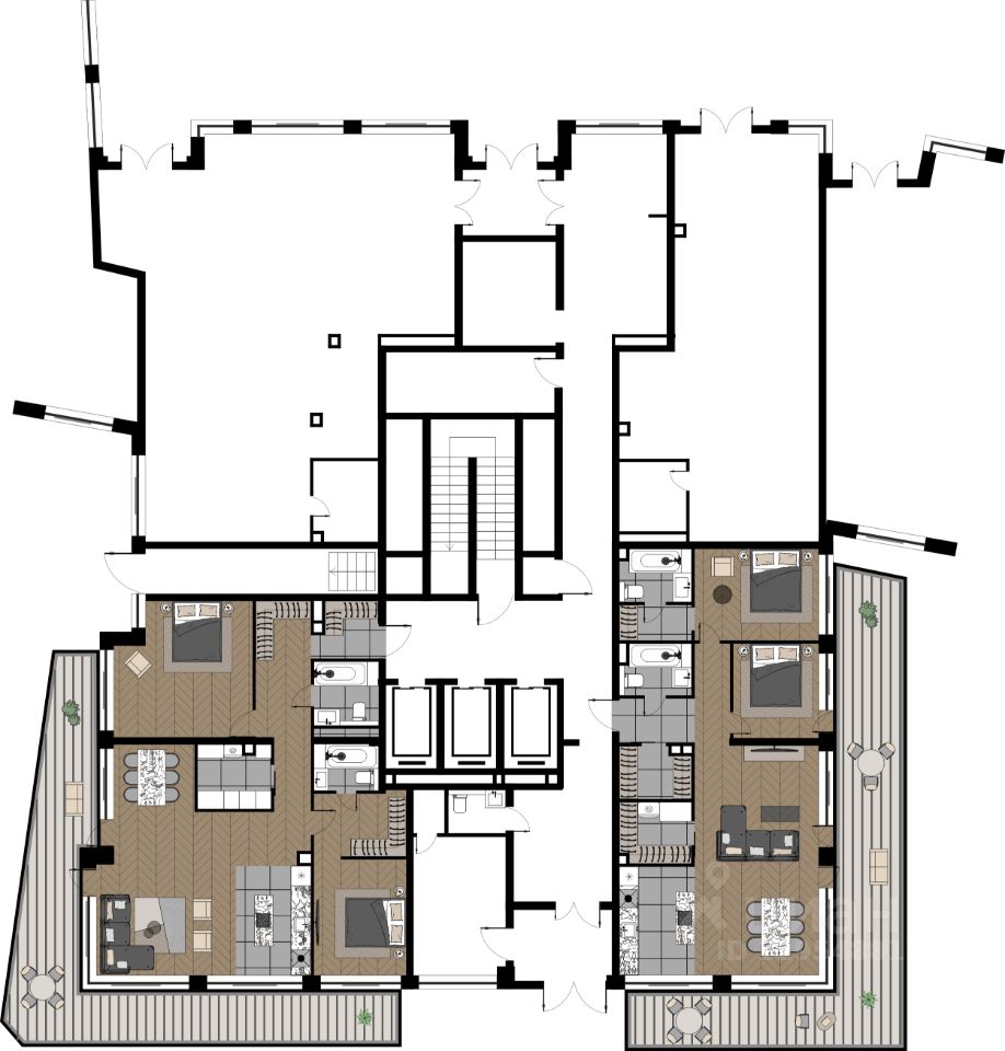 • Квартиры с просторными террасами — выход на свежий воздух прямо из дома, гармония природы и городской роскоши.