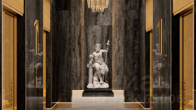 Просторное гранд-лобби с высотой потолка 7м. Дизайн Гранд Лобби выполнен в стиле классических люксовых отелей с использованием премиальных материалов.