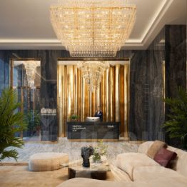 Просторное гранд-лобби с высотой потолка 7м. Дизайн Гранд Лобби выполнен в стиле классических люксовых отелей с использованием премиальных материалов.