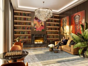 Просторное гранд-лобби с высотой потолка 7м. Дизайн Гранд Лобби выполнен в стиле классических люксовых отелей с использованием премиальных материалов.