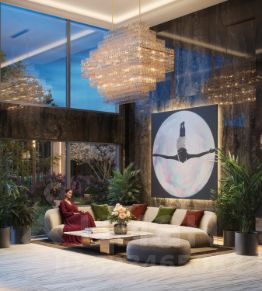 Просторное гранд-лобби с высотой потолка 7м. Дизайн Гранд Лобби выполнен в стиле классических люксовых отелей с использованием премиальных материалов.