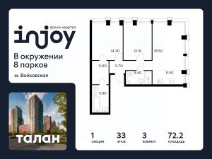 Прямая продажа от застройщика. В жилом квартале, расположенном в Войковском районе Москвы, продаётся 3-комнатная квартира площадью 72.2 кв.м без отделки. Квартира расположена на 33 этаже 35-этажного дома, корпус 1, в жилом квартале бизнес-класса INJOY.