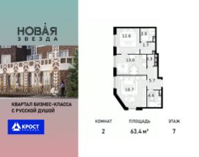 Продаётся 2-к квартира 63.4 кв.м. на 7-м этаже 22 этажного дома, корпус 3 - Резиденция "Краснодар". Без отделки.