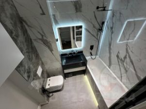 Совмещенный санузел 4 кв.м. Весь СУ отделан крупноформатным итальянским керамогранитом. Ванная Villeroy&Boch. Смесители, унитаз, гигиенический душ фирмы Timo.