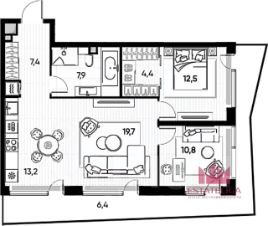 - Просторная кухня-гостиная (32,9 м²) идеально подходит для отдыха и встреч с друзьями.
