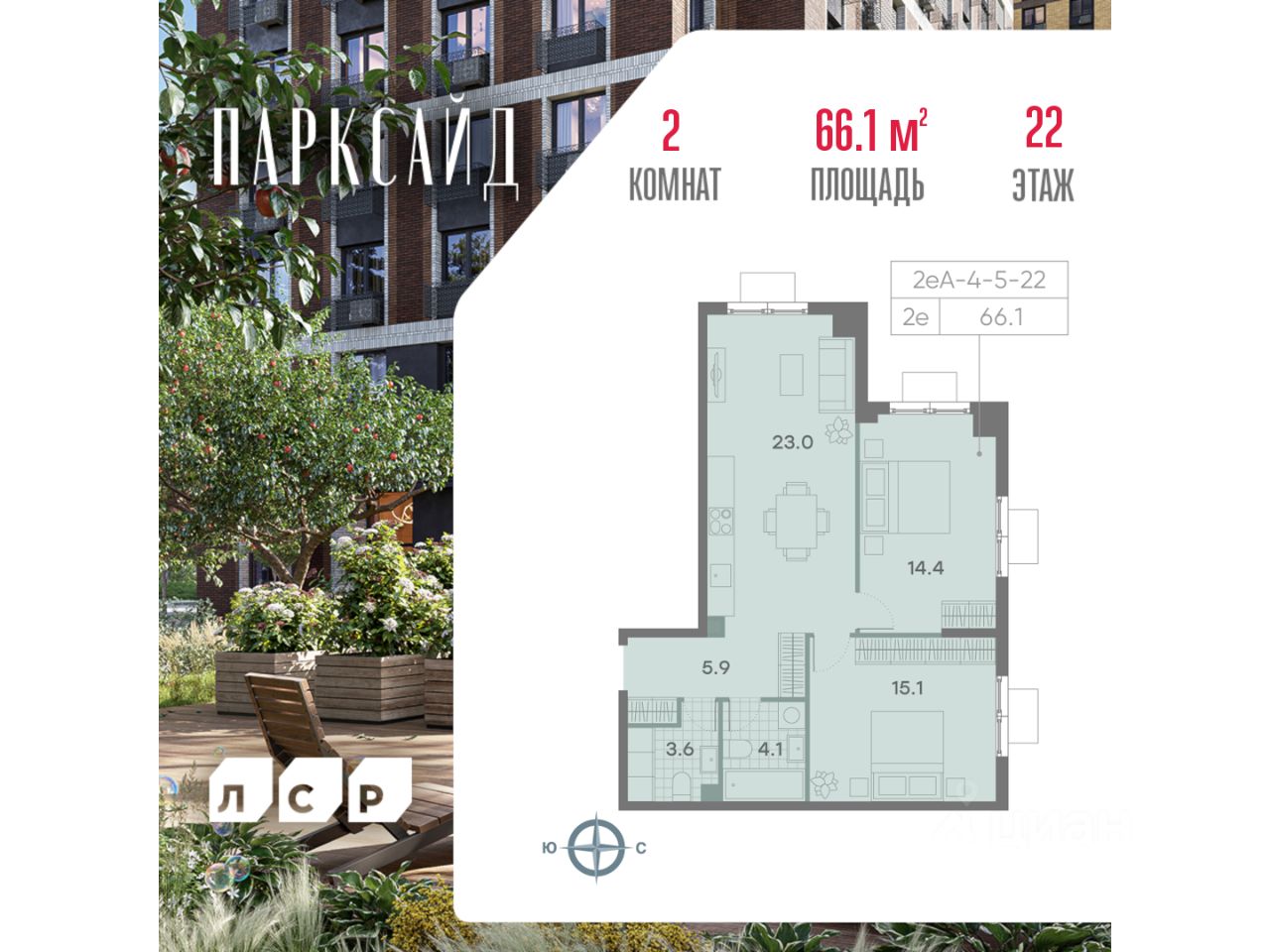 Продаётся 2-комнатная квартира общей площадью 66.1 кв. метров на 22 этаже жилого квартала Парксайд. Возводится в районе Чертаново Центральное Южного административного округа Москвы. В 2 км от будущего комплекса находится станция метро "Пражская". Для автомобилистов есть удобные выезды на Варшавское шоссе и Чертановскую улицу.