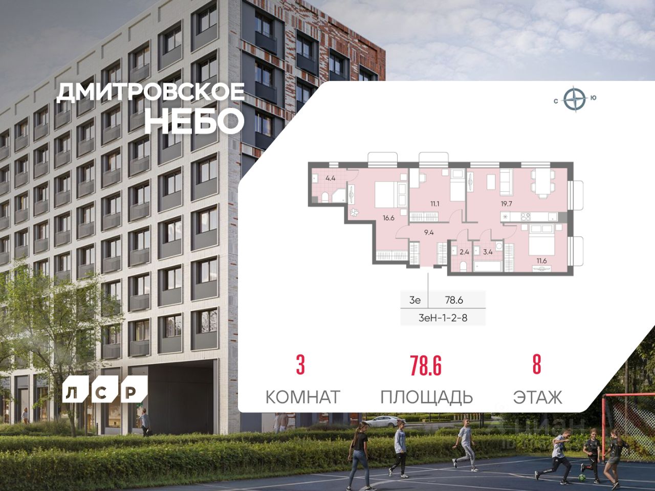 Продается 3-комнатная квартира общей площадью 78.6 кв. метров на 8 этаже жилого комплекса Дмитровское небо. Комплекс возводится в Северном административном округе в районе Западное Дегунино в Ильменском проезде, в 5 минутах ходьбы от метро "Верхние Лихоборы", а автомобилисты могут за пару минут выехать на Ильменский проезд и по нему добраться до Дмитровского шоссе.