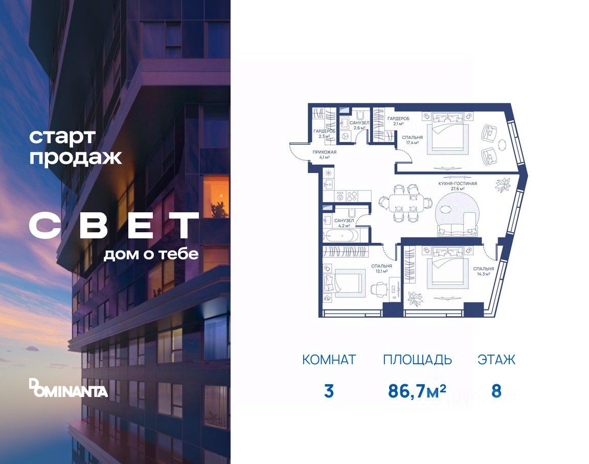 Продаётся 3-к квартира 86.7 кв.м. на 8-м этаже 51 этажного дома.
