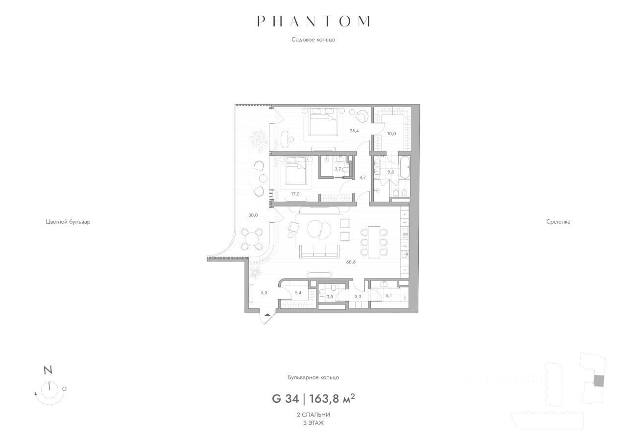 Продаётся 2-комнатная квартира в строящемся доме (Корпус северный), срок сдачи: III-кв. 2027, общей площадью 163.8 кв.м., на 3 этаже. Жилой комплекс с подземной автостоянкой