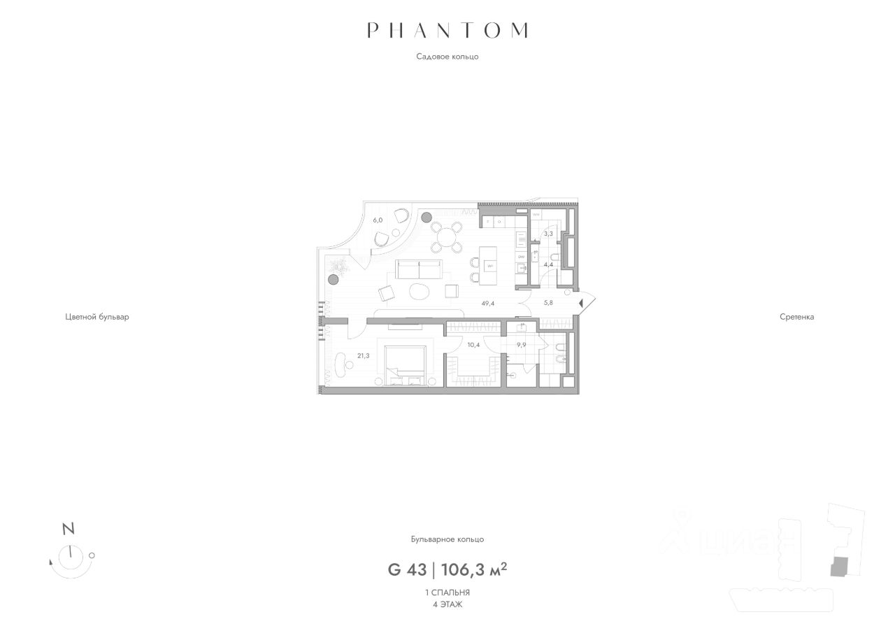 Продаётся 1-комнатная квартира в строящемся доме (Корпус северный), срок сдачи: III-кв. 2027, общей площадью 106.3 кв.м., на 4 этаже. Жилой комплекс с подземной автостоянкой