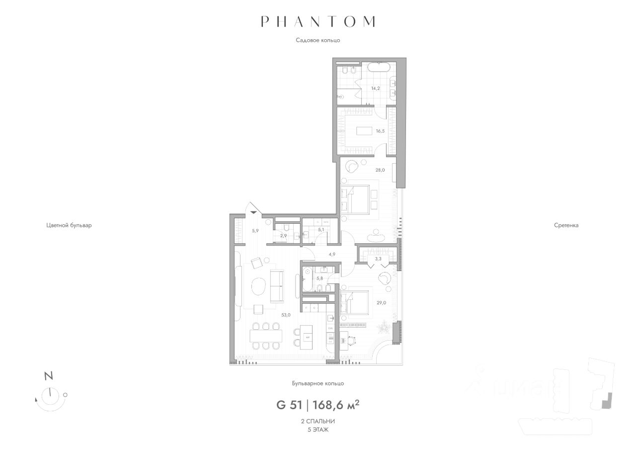 Продаётся 2-комнатная квартира в строящемся доме (Корпус северный), срок сдачи: III-кв. 2027, общей площадью 168.4 кв.м., на 5 этаже. Жилой комплекс с подземной автостоянкой