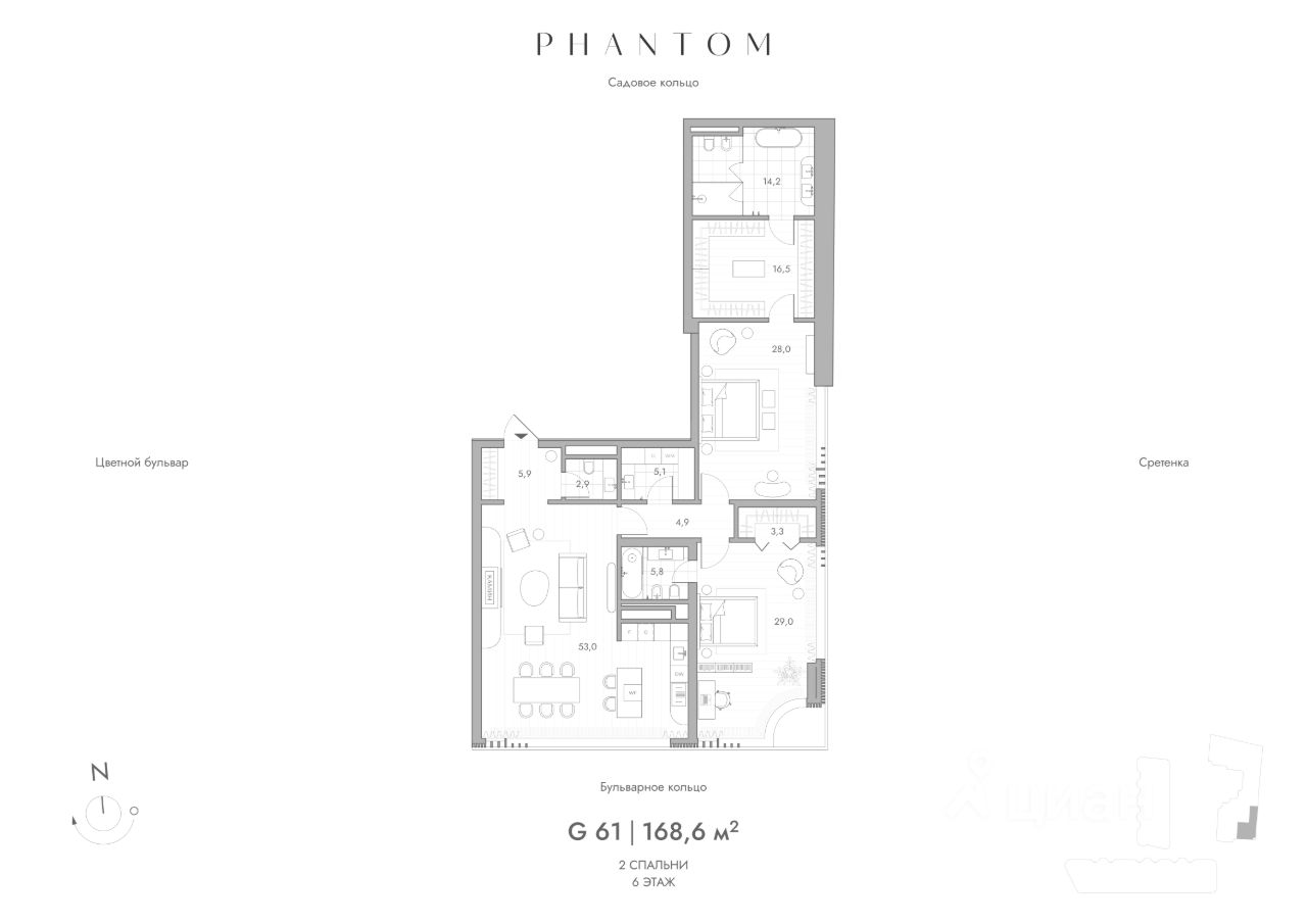 Квартира на 2 стороны света, с продуманной, эргономичной планировкой и уютной зоной гостиной, предусматривающей установку дровяного камина. Роскошная мастер-зона с большой с просторной гардеробной.