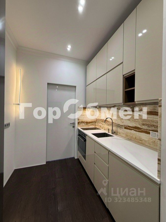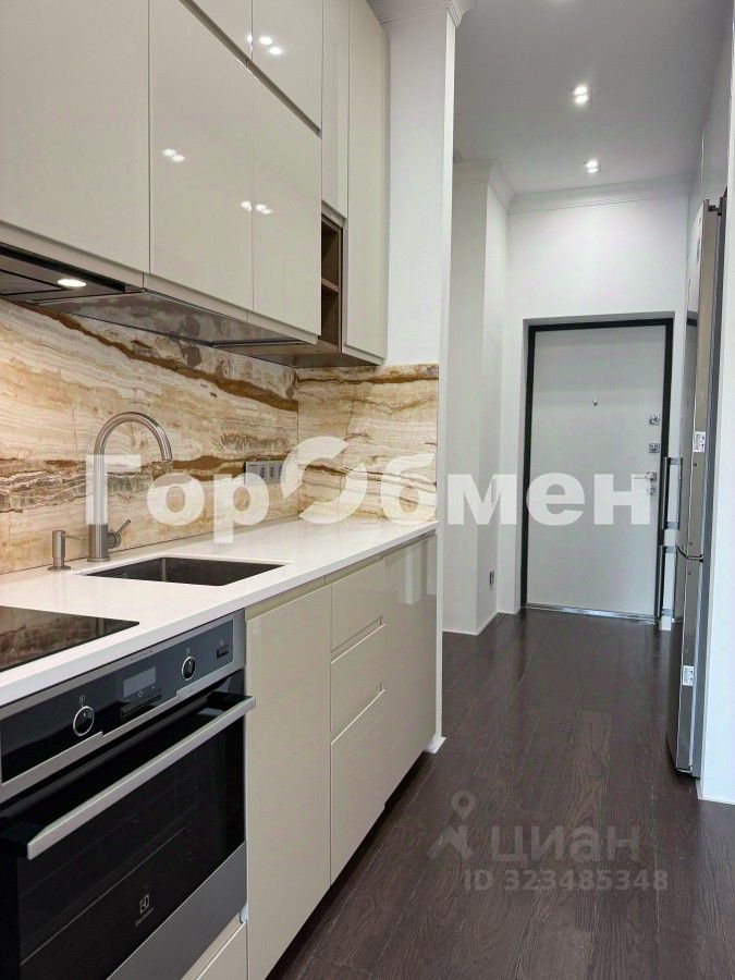 Встроенная кухня отделана натуральным ониксом, оборудована варочной панелью, духовкой, вытяжкой, посудомоечной машиной.