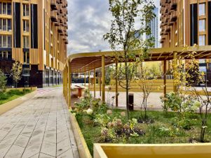 На внутридворовой территории запланировано 3 детских площадки, еще 2 расположат на внешней территории комплекса. На площадках разместят качели, горки, лазалки-переправы, качалки на пружинках и другие игровые комплексы. Вся территория будет озеленена, планируется высадка деревьев лиственных и хвойных пород, будет устроен водопад, прогулочные аллеи, розарий, зона для пикников.