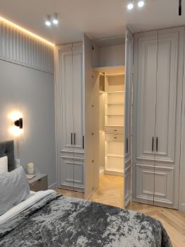 - вся встраиваемая мебель изготовлена в частной мелкосерийной мебельной мастерской, фасады в натуральном шпоне (эвкалипт, американский орех) и итальянской эмали, фасадов в пленке нет;