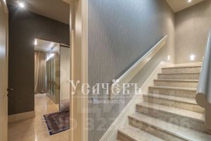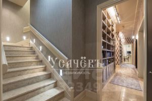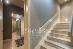 Уровни соединяет изысканная лестница с мраморными ступенями, подчёркивающая статусность интерьера.