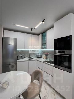 Кухня: Г-образный гарнитур до потолка, каменная столешница, фартук и пол — керамогранит, линейная подсветка рабочей зоны + подсветка витрины, трековый/линейный свет. Встроенная техника: варочная панель, духовой шкаф + СВЧ, высокий холодильник.