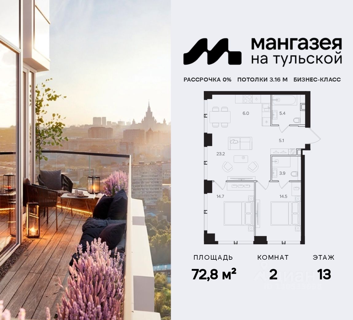 2-комнатная квартира площадью 72,8 м2.