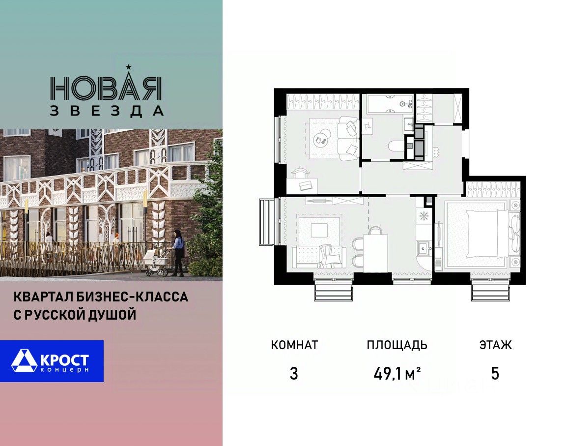 Продаётся 3-к квартира 49.1 кв.м. на 5-м этаже 21 этажного дома, корпус 1 - Резиденция "Вологда". Без отделки.