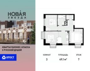 Продаётся 3-к квартира 49.1 кв.м. на 7-м этаже 21 этажного дома, корпус 1 - Резиденция "Вологда". Без отделки.