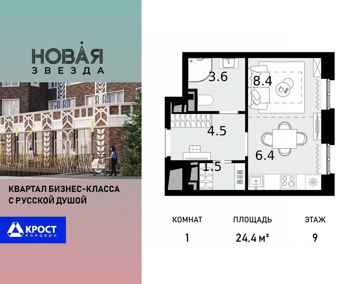 Продаётся 1-к квартира 24.4 кв.м. на 9-м этаже 22 этажного дома, корпус 6 - Резиденция "Хабаровск". Без отделки.
