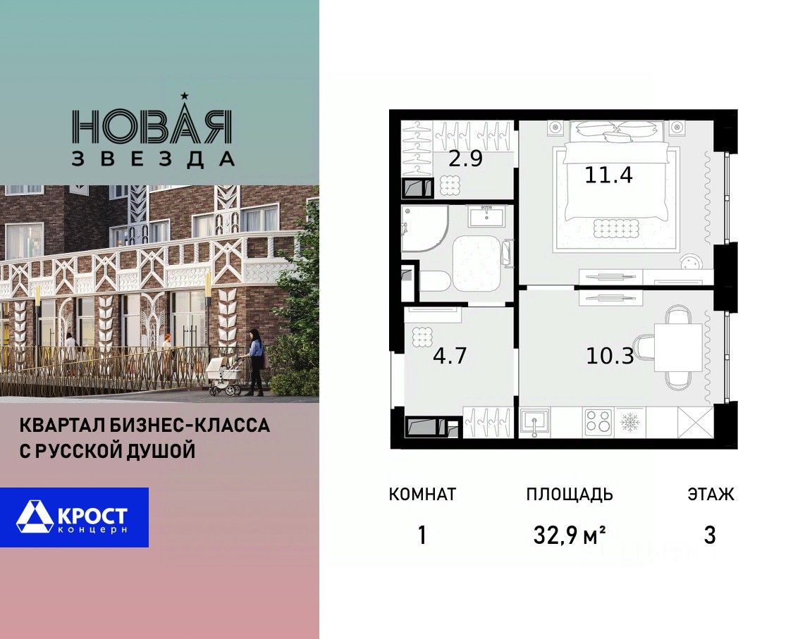 Продаётся 1-к квартира 32.9 кв.м. на 3-м этаже 22 этажного дома, корпус 3 - Резиденция "Краснодар". Без отделки.