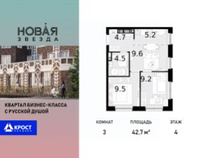 Продаётся 3-к квартира 42.7 кв.м. на 4-м этаже 22 этажного дома, корпус 3 - Резиденция "Краснодар". Без отделки.
