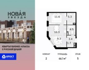 Продаётся 2-к квартира 46.1 кв.м. на 5-м этаже 22 этажного дома, корпус 3 - Резиденция "Краснодар". Без отделки.