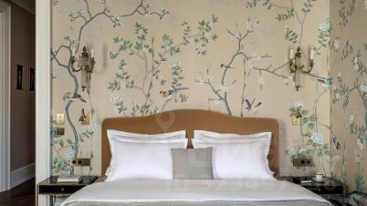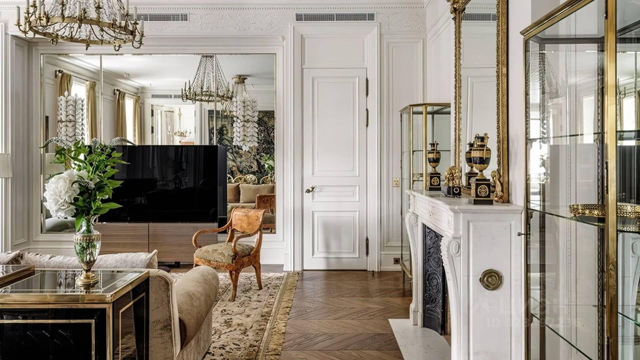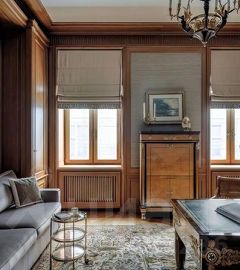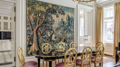 Уникальные элементы отделки включают мрамор в санузлах, панели из красного дерева в кабинете и шелковые обои ручной работы в спальне. Интерьер обогащен подлинными артефактами, такими как гобелен XVIII века и антикварные люстры, которые соседствуют с современной системой приточно-вытяжной вентиляции с климат-контролем.