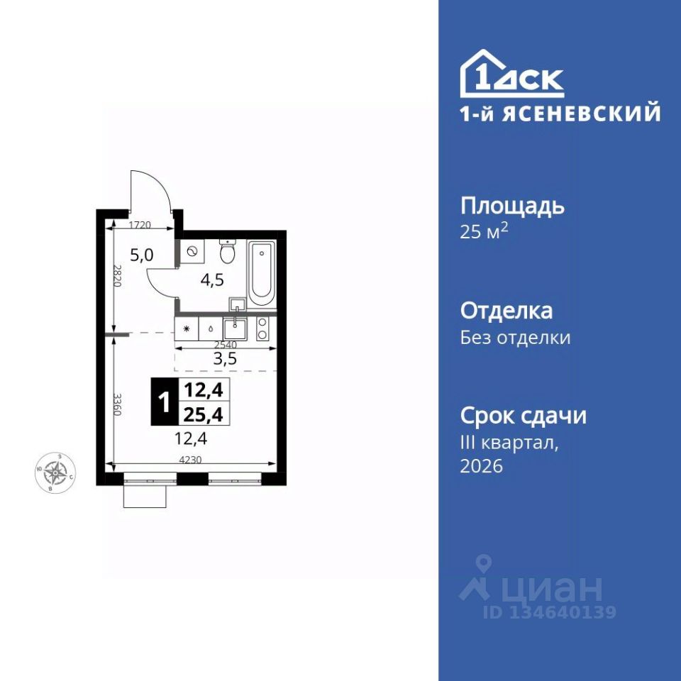 Продаётся квартира-студия номер 680 общей площадью 25.4 кв.м. на 12-м этаже 18 этажного здания. Без отделки.