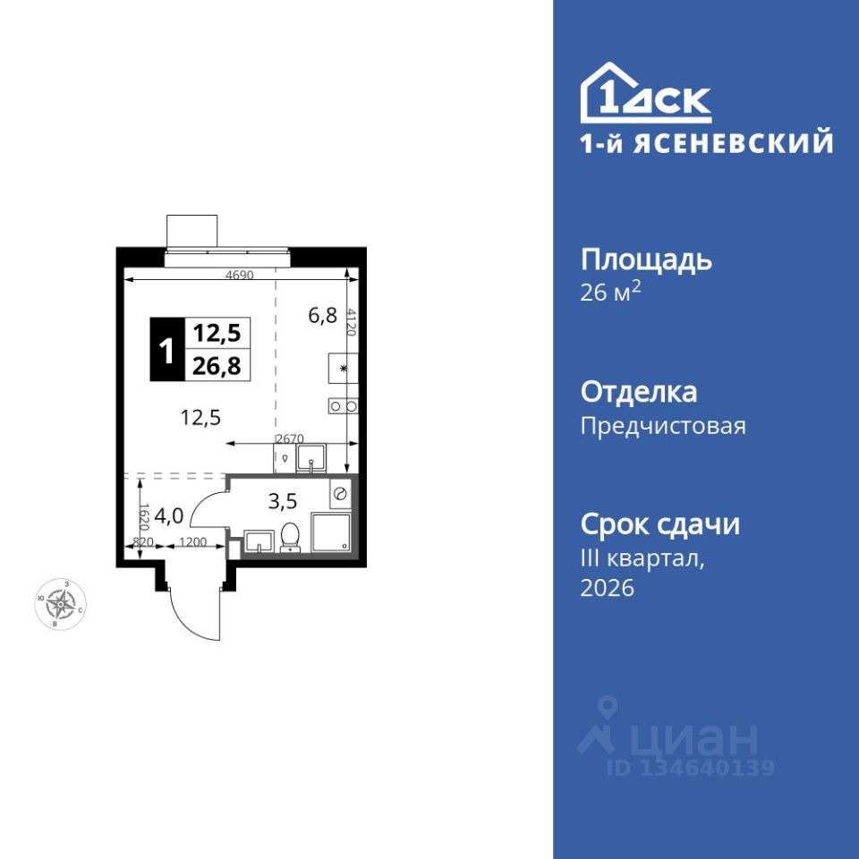 Продаётся квартира-студия номер 127 общей площадью 26.8 кв.м. на 14-м этаже 16 этажного здания. Отделка Whitebox.