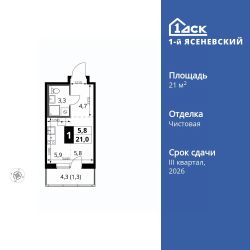 Продаётся квартира-студия номер 415 общей площадью 21 кв.м. на 9-м этаже 9 этажного здания. Чистовая отделка.
