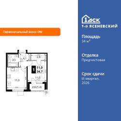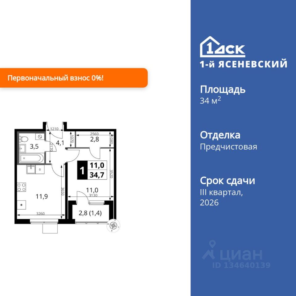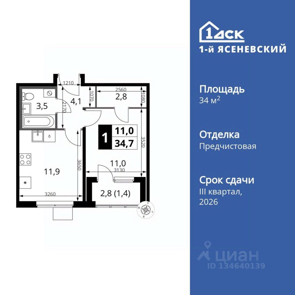Продаётся 1-к квартира номер 553 общей площадью 34.7 кв.м. на 14-м этаже 18 этажного здания. Отделка Whitebox.