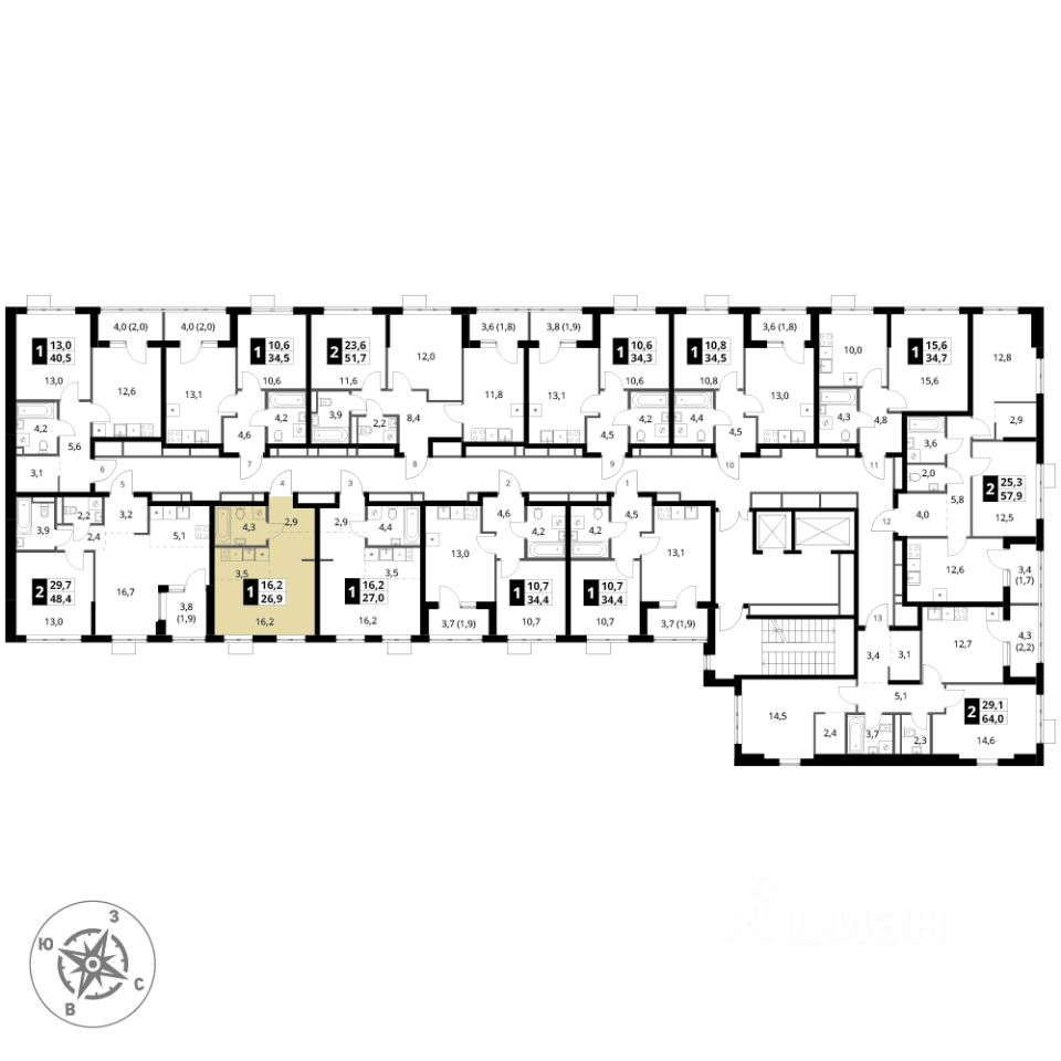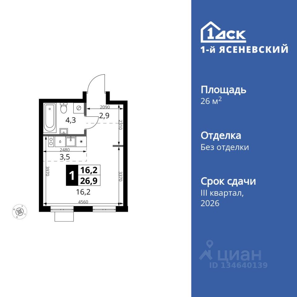 Продаётся квартира-студия номер 266 общей площадью 26.9 кв.м. на 13-м этаже 18 этажного здания. Без отделки.