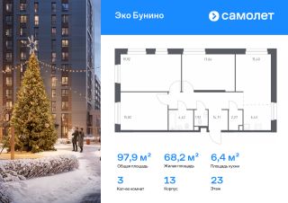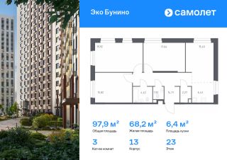 Строим кварталы для жизни с заботой о будущем. Предлагается 3-комнатная квартира комфорт-класса 97,93 кв.м в корпусе 13 на 23 этаже, в ЖК "Эко Бунино"