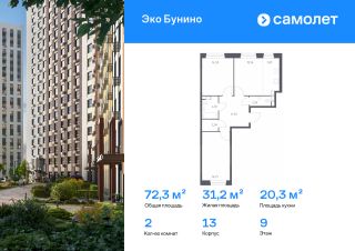 Строим кварталы для жизни с заботой о будущем. Предлагается 2-комнатная квартира комфорт-класса 72,33 кв.м в корпусе 13 на 9 этаже, в ЖК "Эко Бунино"
