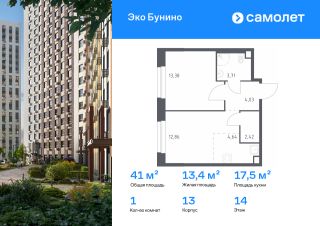 Строим кварталы для жизни с заботой о будущем. Предлагается 1-комнатная квартира комфорт-класса 41,04 кв.м в корпусе 13 на 14 этаже, в ЖК "Эко Бунино"