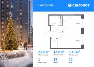 Строим кварталы для жизни с заботой о будущем. Предлагается 1-комнатная квартира комфорт-класса 34,47 кв.м в корпусе 13 на 12 этаже, в ЖК "Эко Бунино"