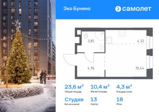 Строим кварталы для жизни с заботой о будущем. Предлагается квартира студия комфорт-класса 23,57 кв.м в корпусе 13 на 18 этаже, в ЖК "Эко Бунино"
