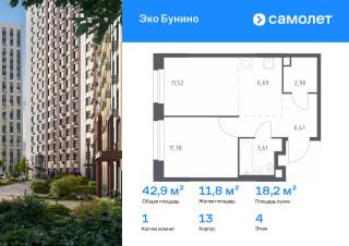 Строим кварталы для жизни с заботой о будущем. Предлагается 1-комнатная квартира комфорт-класса 42,91 кв.м в корпусе 13 на 4 этаже, в ЖК "Эко Бунино"