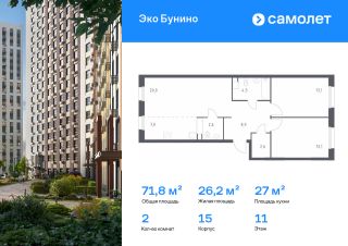 Строим кварталы для жизни с заботой о будущем. Предлагается 2-комнатная квартира комфорт-класса 71,8 кв.м в корпусе 15 на 11 этаже, в ЖК "Эко Бунино"